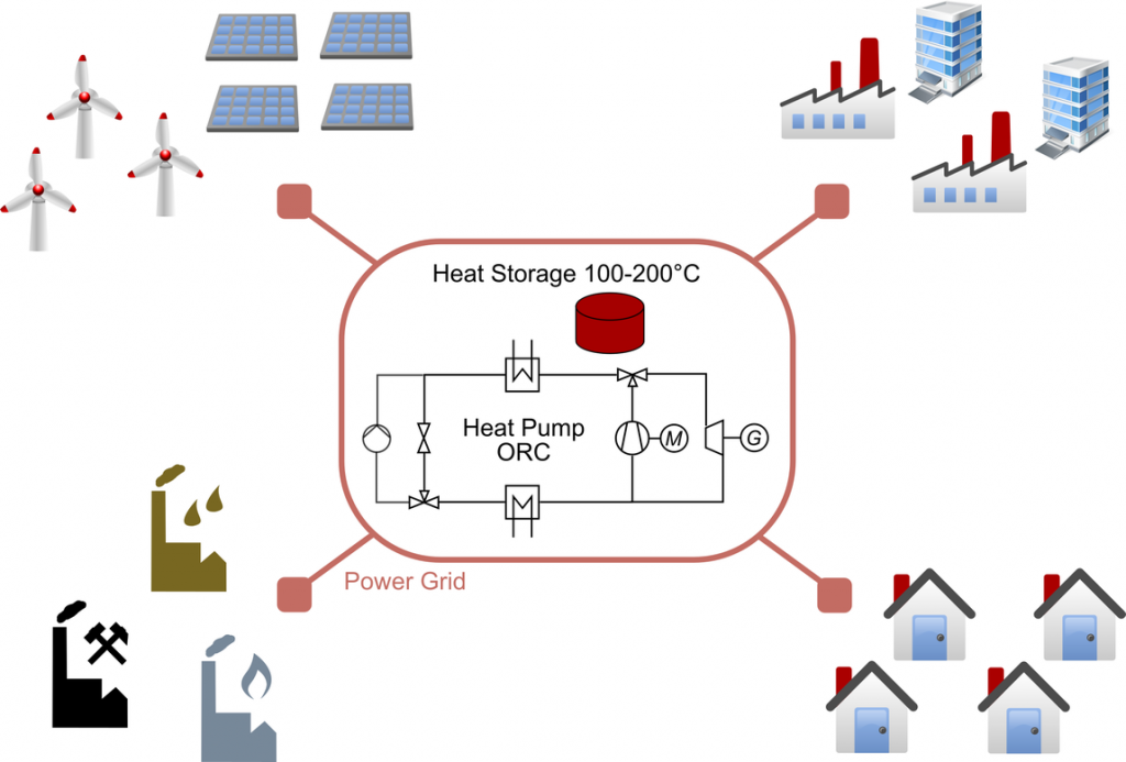 By using base load storage systems with low-temperature storage, the use of polluting thermal power plants should be reduced. During the day, heat from geothermal energy or industrial processes is upgraded with excess electricity from photovoltaics using heat pumps (HP) and stored in a low-temperature storage system. To generate nocturnal base load power, this heat energy is then removed from the storage via an Organic Rankine Cycle (ORC) process.